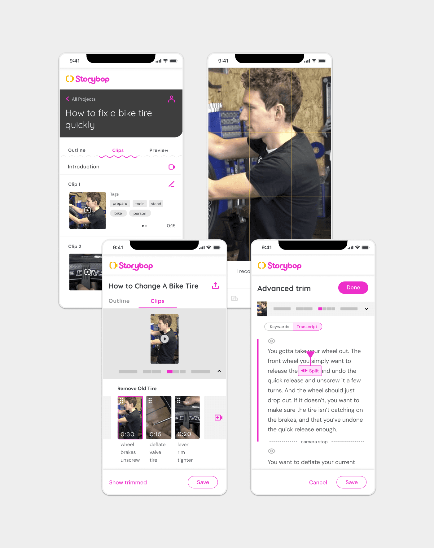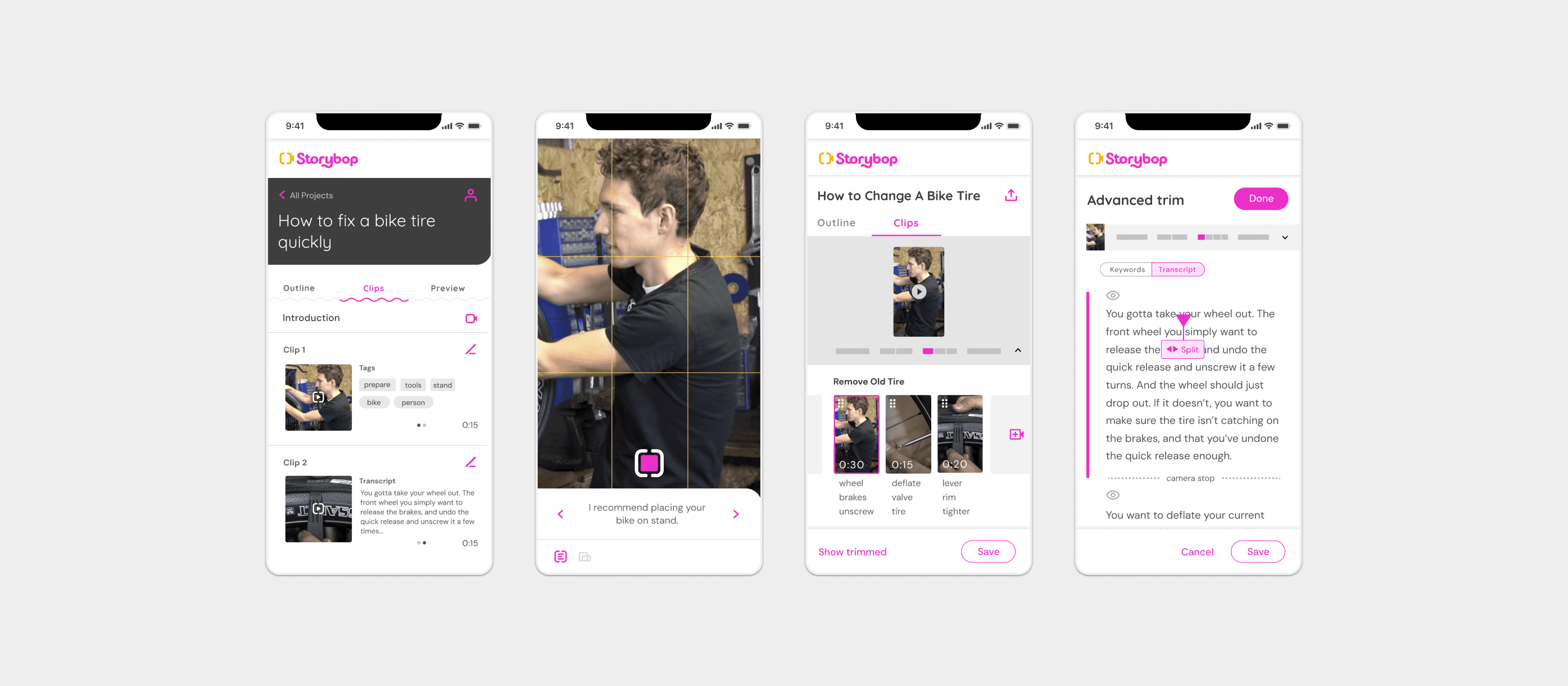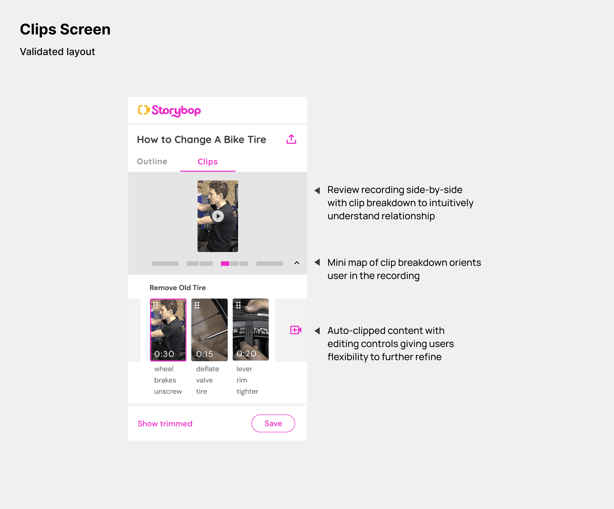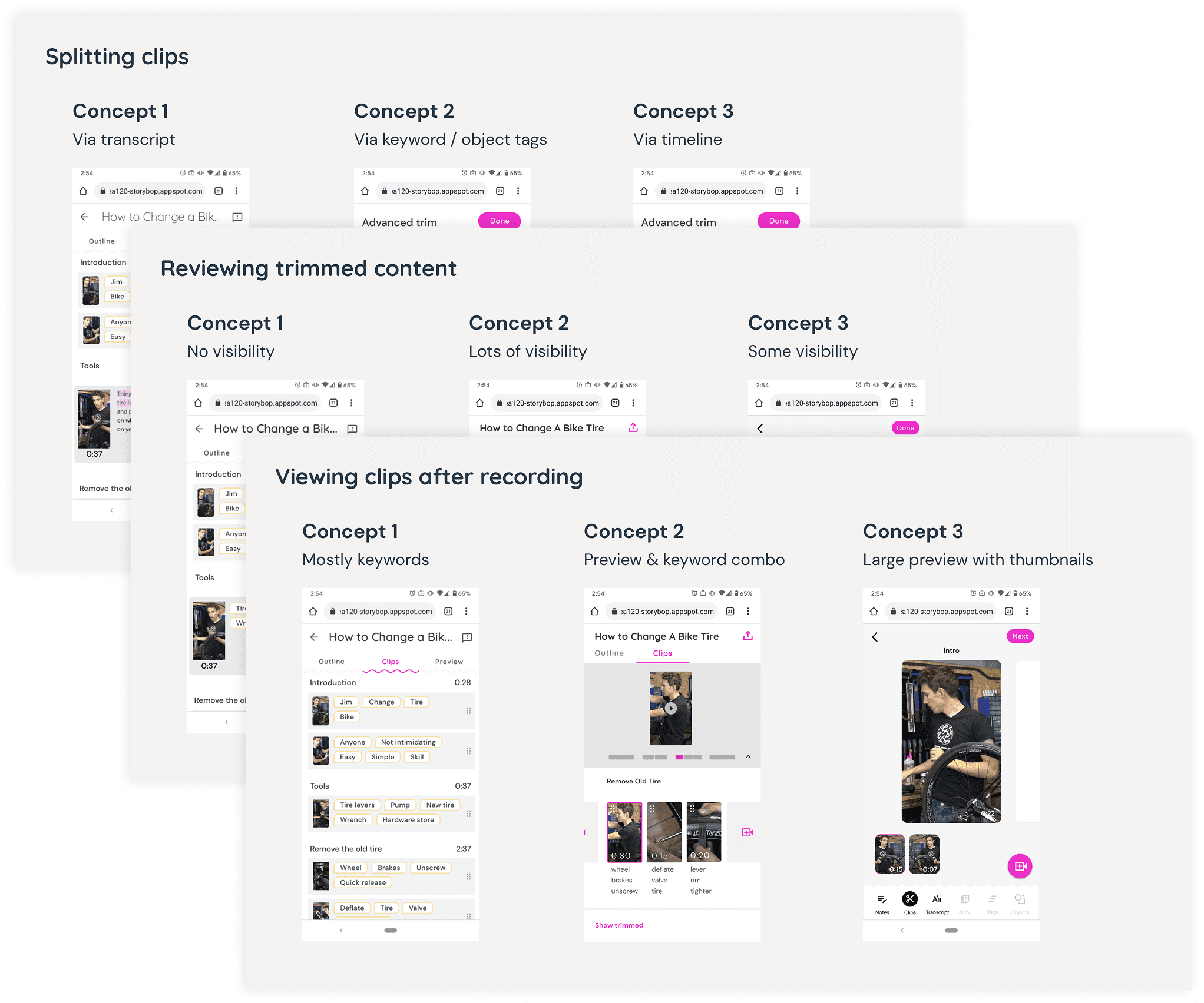 Visual test concepts and example validated layout for a product that automatically organized video clips for content creators
